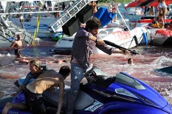 浮かれまくりの若者たちがピラニア軍団に襲われる様子がとってもとっても阿鼻叫喚。悲惨な地獄絵図です。